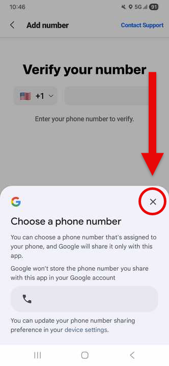 On the verification screen, a Google pop-up may appear that says “Choose a phone number.”